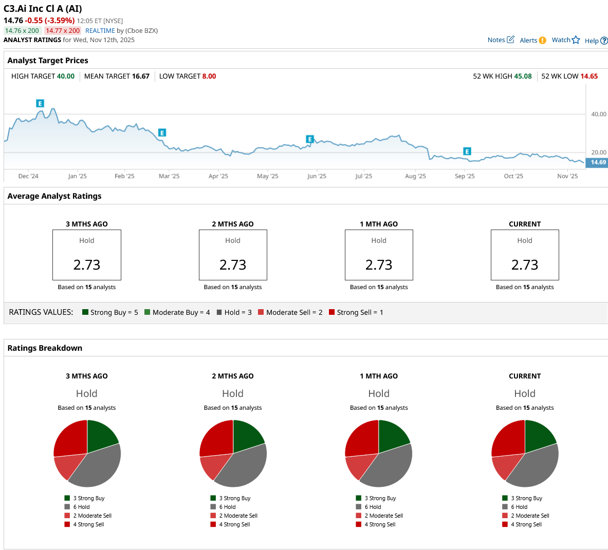 C3.ai is a loss-making company struggling with slowing sales, making it a high-risk investment at present. Out of the 15 analysts covering AI stock, three recommend “Strong Buy,” six recommend “Hold,” two recommend “Moderate Sell,” and four recommend “Strong Sell.” The average C3.ai stock price target is $16.67, above the current price of $14.76.