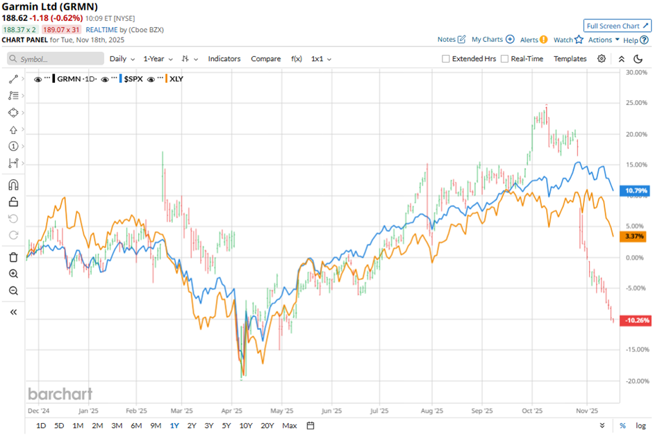 Despite reporting better-than-expected Q3 2025 adjusted EPS of $1.99, GRMN shares tumbled 11.5% on Oct. 29 as the company missed revenue expectations with $1.77 billion, as both the outdoor segment fell 5% and auto OEM revenue fell 2%. Garmin also reported a sharp 15% jump in operating expenses to $590 million, driven by higher personnel and R&D/SG&A costs.