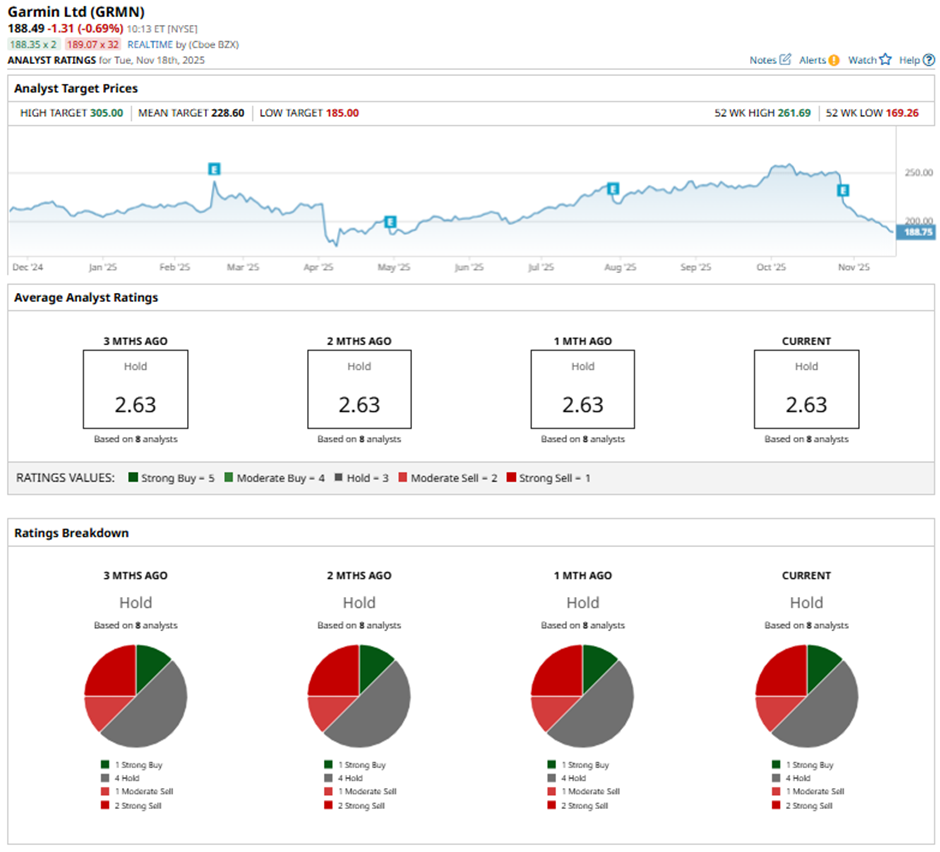 The mean price target of $228.60 represents a 21.3% premium to GRMN’s current price levels. The Street-high price target of $305 suggests a 61.8% potential upside.