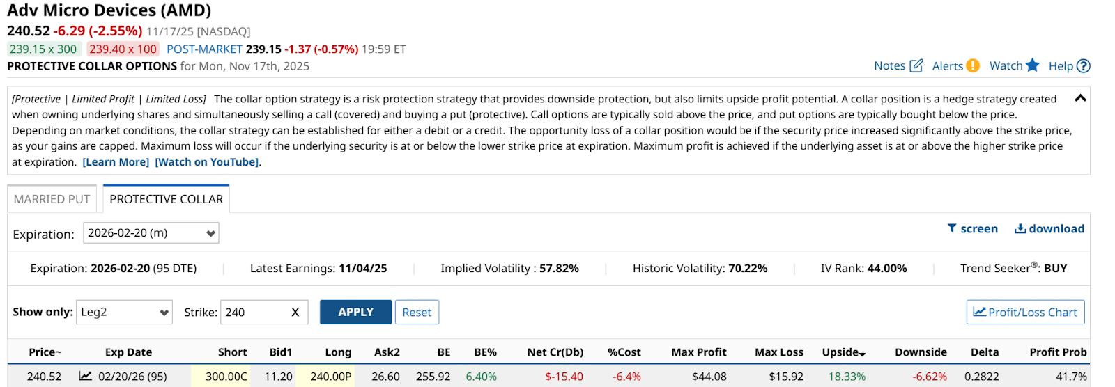I wrote about AMD for Barchart on Aug. 6, 2025. The stock had just rocketed up in price, then slipped after releasing earnings. I concluded from my chart analysis that AMD had upside potential, but that an option collar could take the edge off. By lowering risk.