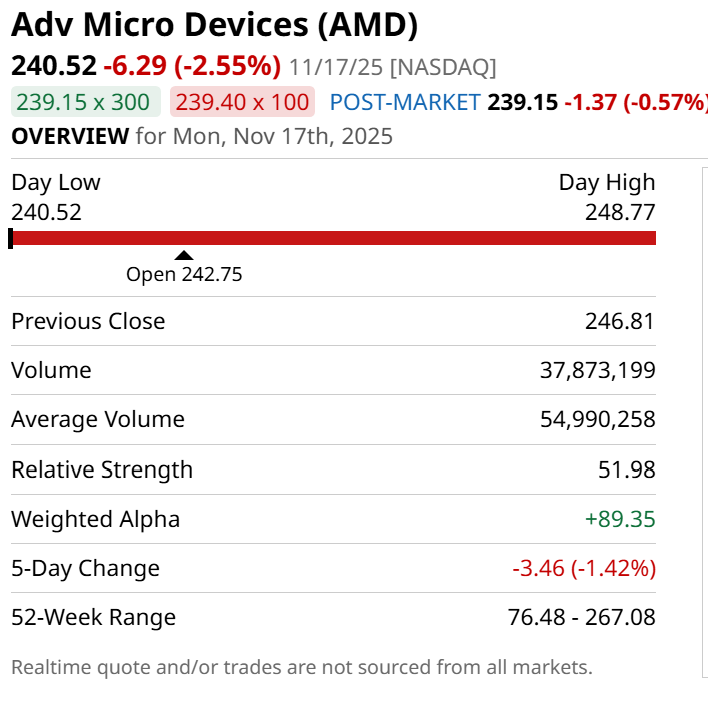 A later article on Oct. 7 mapped out an option collar between $200 and $250, expiring this January. Here’s a quick history of AMD’s stock price during that time, through Monday’s close: