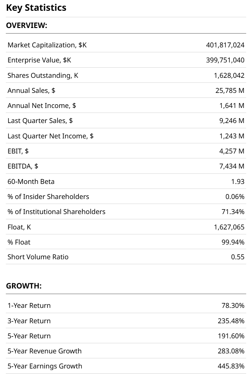 We don’t see too many stocks this big that have a 52-week price range from $76 to $267. So as a risk manager, my thought is, as always, to try to have my cake and eat it too.