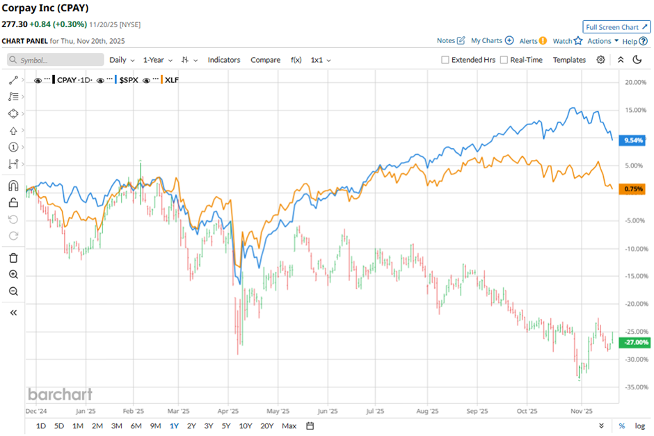 The fuel card and payment products provider's shares have lagged behind the broader market over the past 52 weeks. CPAY stock has decreased 24.9% over this time frame, while the broader S&P 500 Index ($SPXhas rallied 10.5%. Moreover, shares of the company are down 18.1% on a YTD basis, compared to SPX’s 11.2% return.