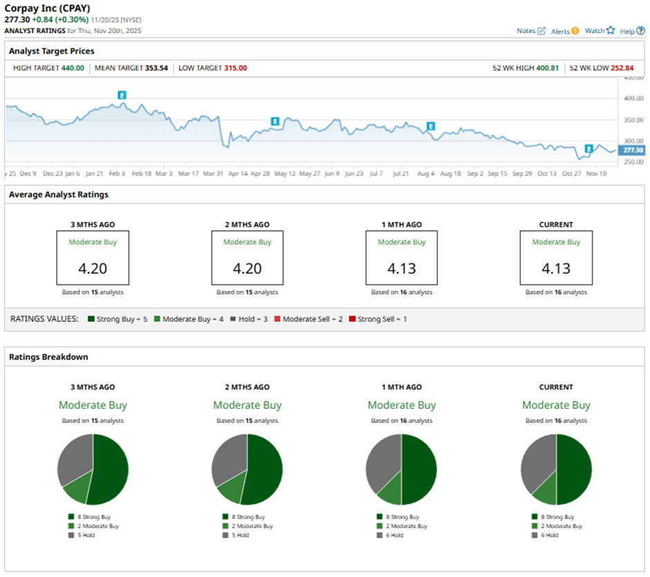 The mean price target of $353.54 represents a 27.5% premium to CPAY’s current price levels. The Street-high price target of $440 suggests a 58.7% potential upside.