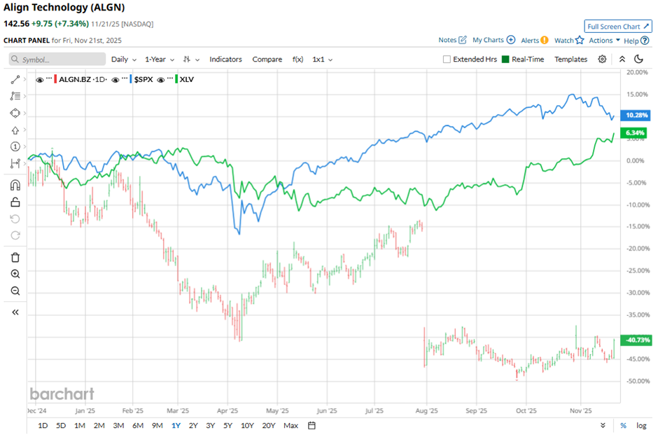 With a market cap of $10.2 billion, Align Technology, Inc. (ALGN) is a global medical device company best known for its Invisalign clear aligners, Vivera retainers, and iTero intraoral scanners. The company provides advanced orthodontic and restorative digital solutions across the United States, Switzerland, and international markets.