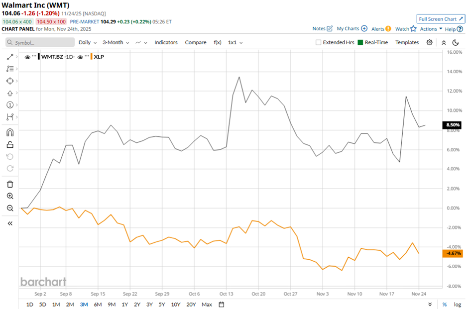 Shares of the Bentonville, Arkansas-based company have decreased over 5% from its 52-week high of $109.57. Over the past three months, its shares have risen 7.5%, surpassing the Consumer Staples Select Sector SPDR Fund’s (XLP) 6.6% decline during the same period.