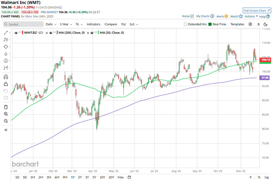 With a market cap of $829.7 billion, Walmart Inc. (WMT) is a global retailer that operates through three main segments: Walmart U.S., Walmart International, and Sam’s Club. The company runs retail and wholesale stores, eCommerce platforms, and digital payment services, offering a broad assortment of merchandise, groceries, health and wellness products, and financial solutions.