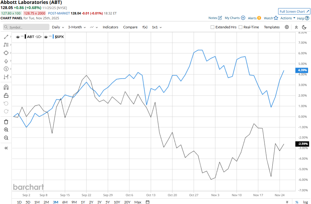 Abbott touched its three-year high of $141.23 on Mar. 4 and is currently trading 9.3% below that peak. Meanwhile, ABT stock prices have declined 2.9% over the past three months, compared to the S&P 500 Index’s ($SPX) 5.1% gains during the same time frame.