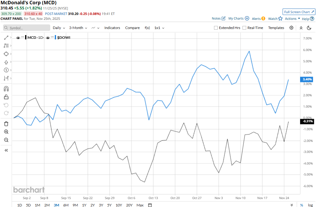 McDonald’s touched its all-time high of $326.32 on Mar. 10 and is currently trading 4.9% below that peak. Meanwhile, MCD stock has observed a marginal 95 bps dip over the past three months, notably underperforming the Dow Jones Industrial Average’s ($DOWI) 4% gains during the same time frame.