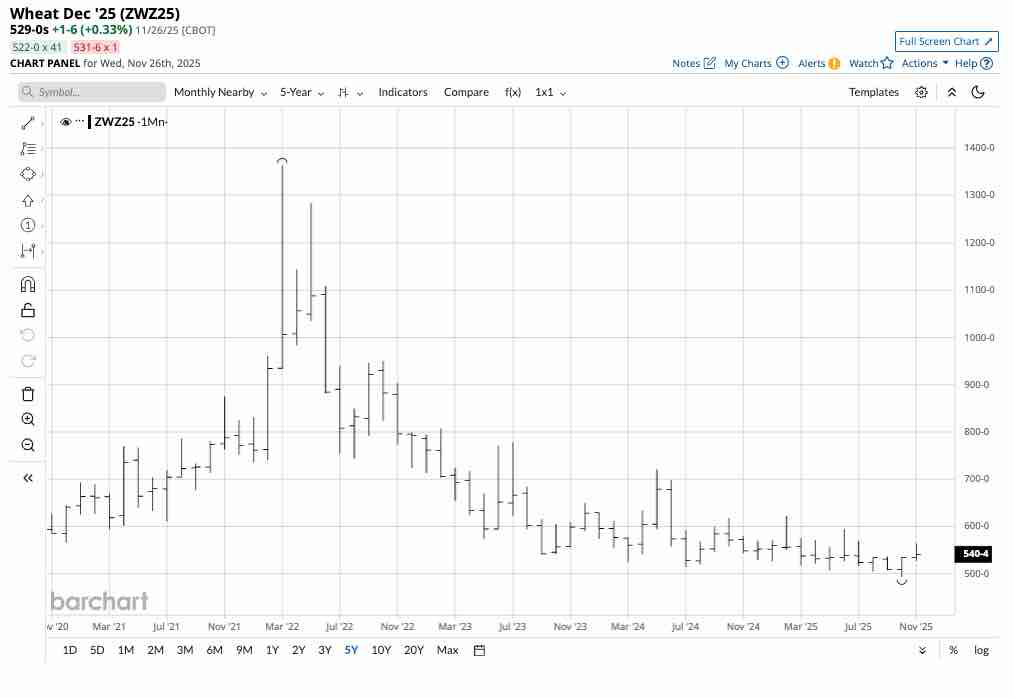 The monthly continuous CBOT wheat futures contract exhibits a bearish trend, with the price 63.9% lower from the March 2022 high to the low in October 2025.