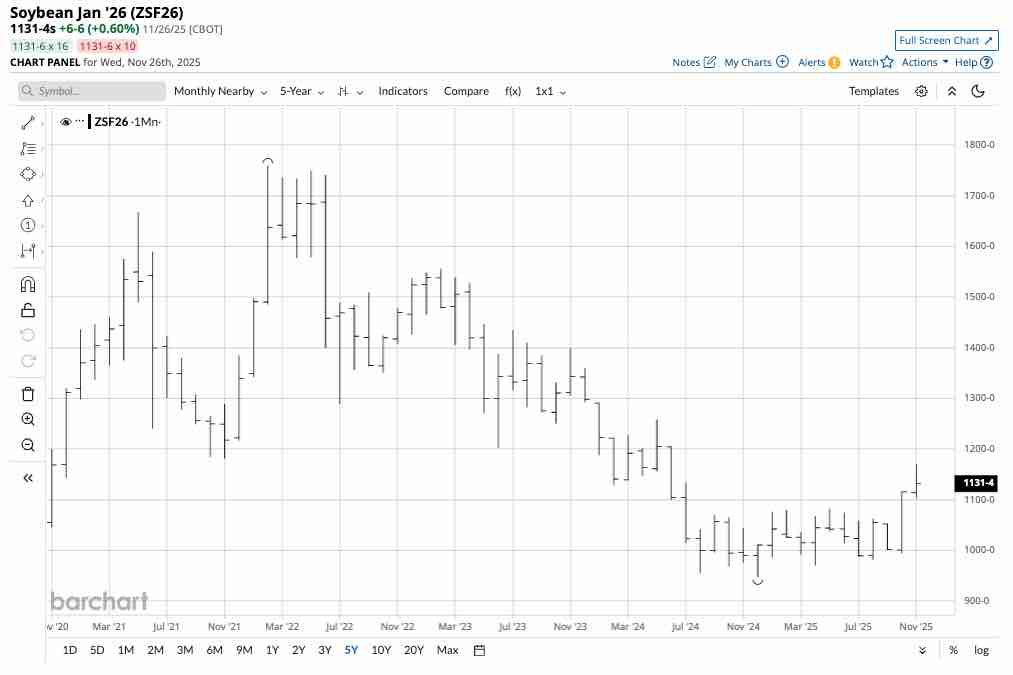 The monthly CBOT continuous soybean futures chart illustrates the 23.5% recovery rally from the December 2024 low of $9.47 to the November 2025 high of $11.6950 per bushel.