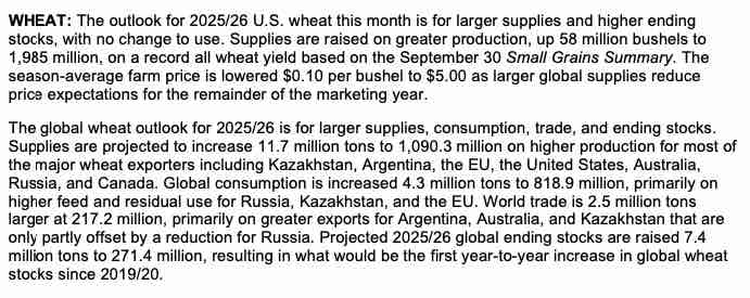 The U.S. Department of Agriculture released its November World Agricultural Supply and Demand Estimates Report on Friday, November 14, after a one-month lapse due to the U.S. government shutdown. The USDA told the wheat market: