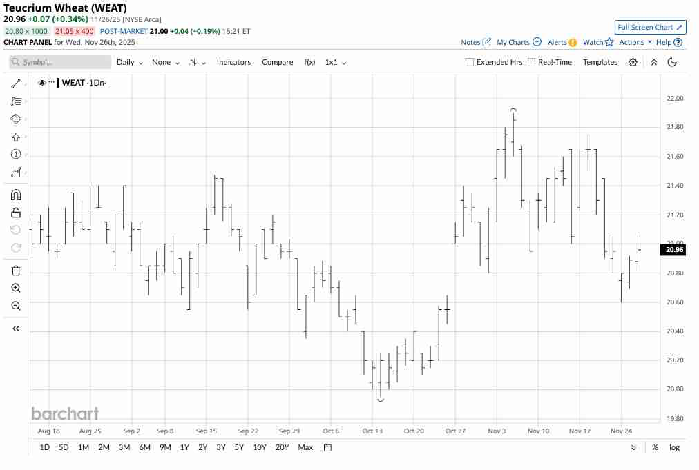 Over the same period, WEAT moved 9.8% higher from $19.95 to $21.90 per share. The WEAT ETF reached its most recent high on November 4 at $21.90 as the deferred contracts rallied to their highest levels on that day. WEAT experienced a 1:5 reverse split on November 25.