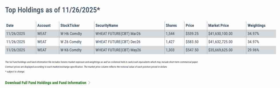 The chart shows that while WEAT does not have exposure to the active month December 2025 CBOT futures contract, it holds virtually equal exposure to the March, May, and December 2026 CBOT wheat futures contracts, which display less price volatility than the nearby December 2025 contract.