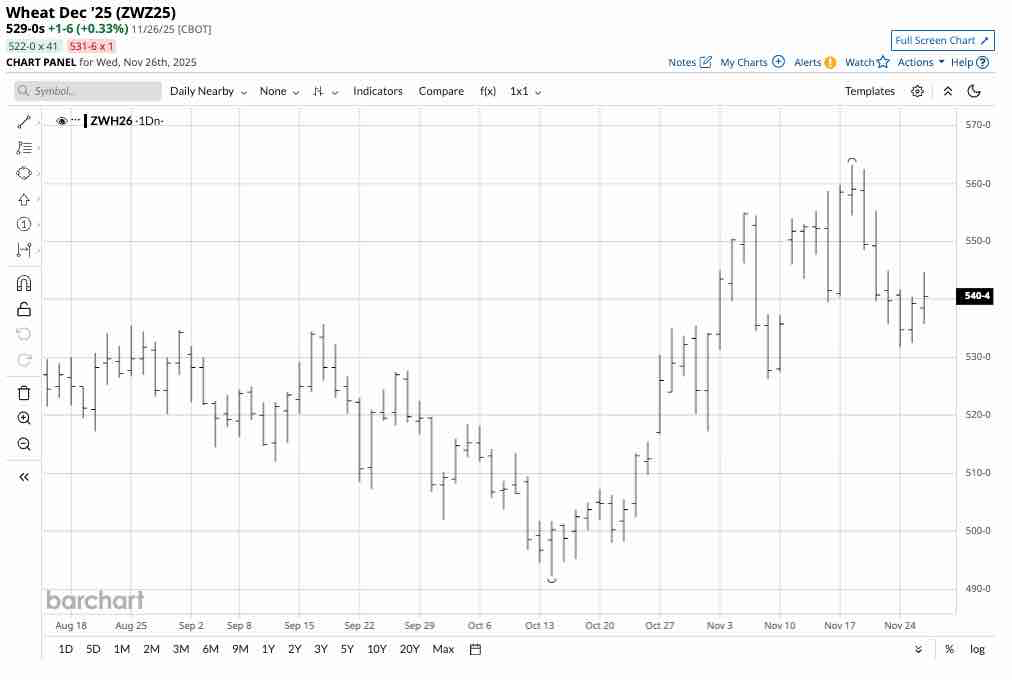 After reaching a low of $4.9225 per bushel on October 14, 2025, CBOT soft red winter wheat futures turned higher, rising to over the $5.60 level.