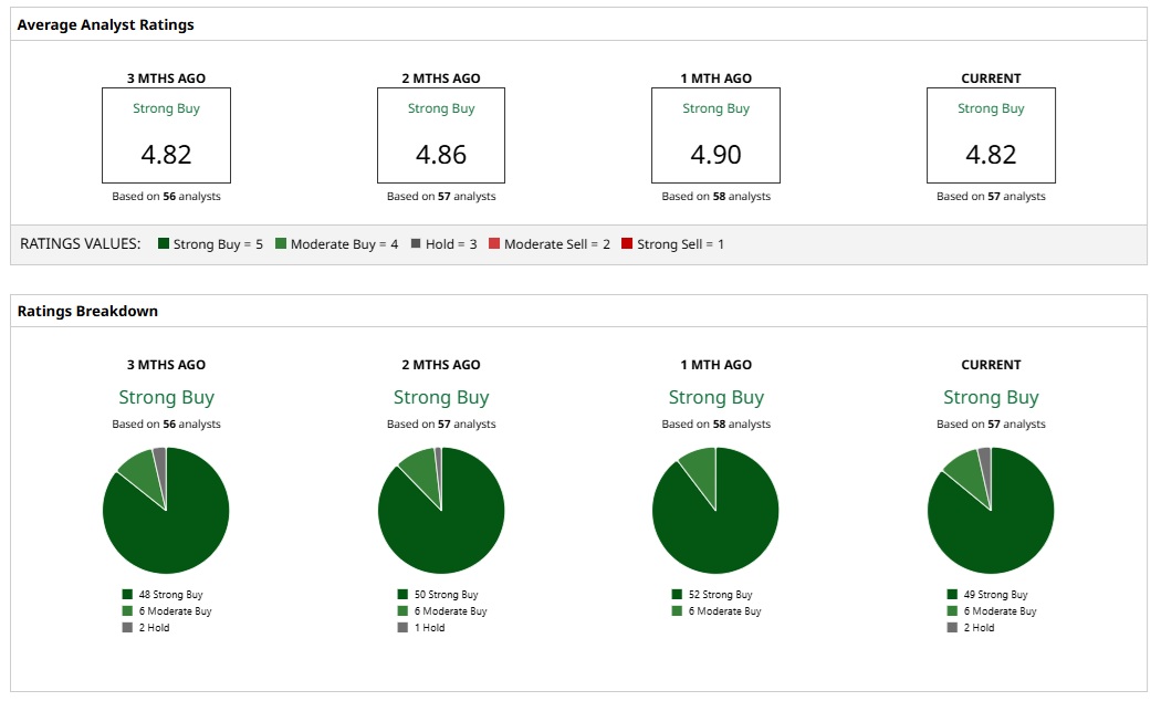An overwhelming majority of 49 analysts have a “Strong Buy” rating for the stock. Further, six and two analysts, respectively, have a “Moderate Buy” and “Hold” rating.