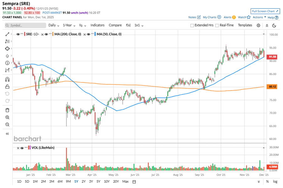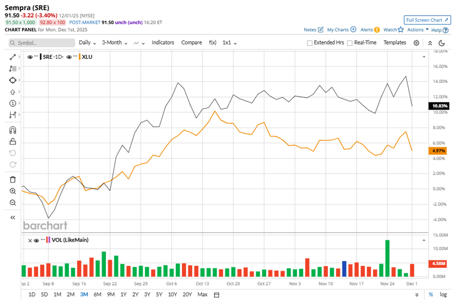 Despite its notable strength, SRE slipped 4.4% from its 52-week high of $95.72, achieved on Oct. 8. Over the past three months, SRE stock gained 10.8%, outperforming the Utilities Select Sector SPDR Fund’s (XLU) 5% gains during the same time frame.