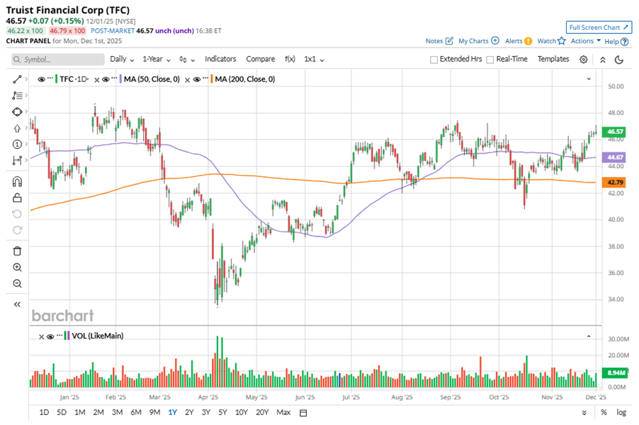 To confirm the bullish trend, TFC has been trading above its 200-day moving average since late June, with slight fluctuations. The stock has been trading above its 50-day moving average since early November, experiencing minor fluctuations.
