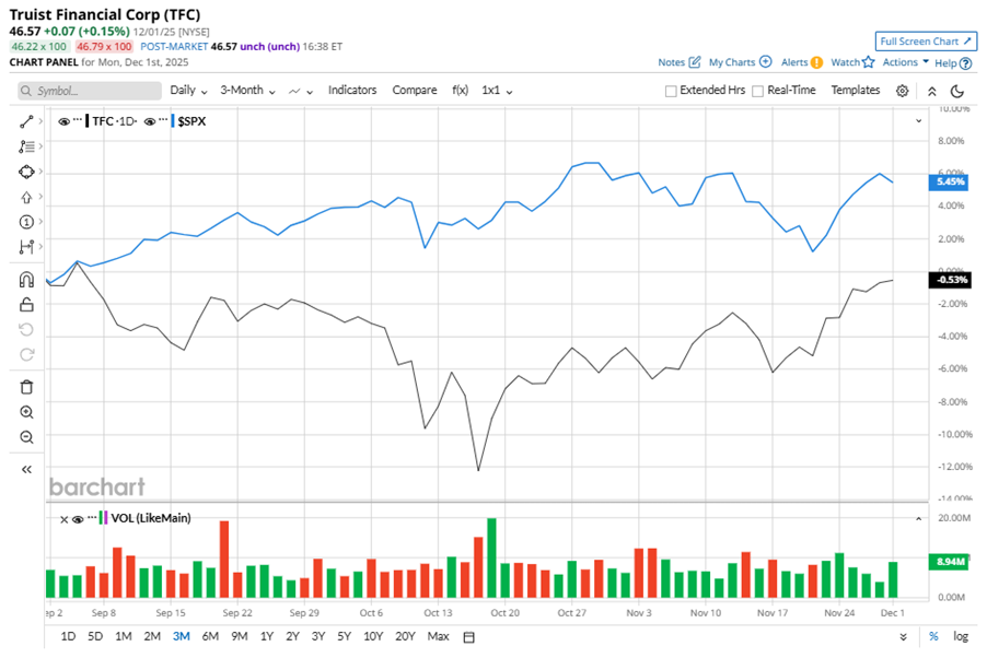 Despite its notable strength, TFC slipped 4% from its 52-week high of $48.53, achieved on Jan. 21. Over the past three months, TFC stock declined marginally, underperforming the S&P 500 Index’s ($SPX) 5.5% gains during the same time frame.