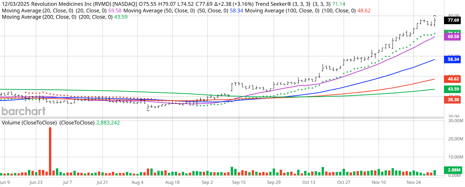 Revolution Medicines hit an all-time high of $79.07 on Dec. 3.