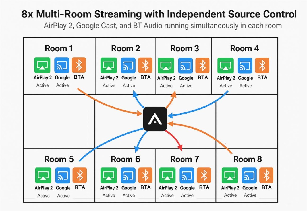 • Each AirPlay 2, Google Cast, and Bluetooth Audio stream can play independently, supporting multi-room or multi-user scenarios.
