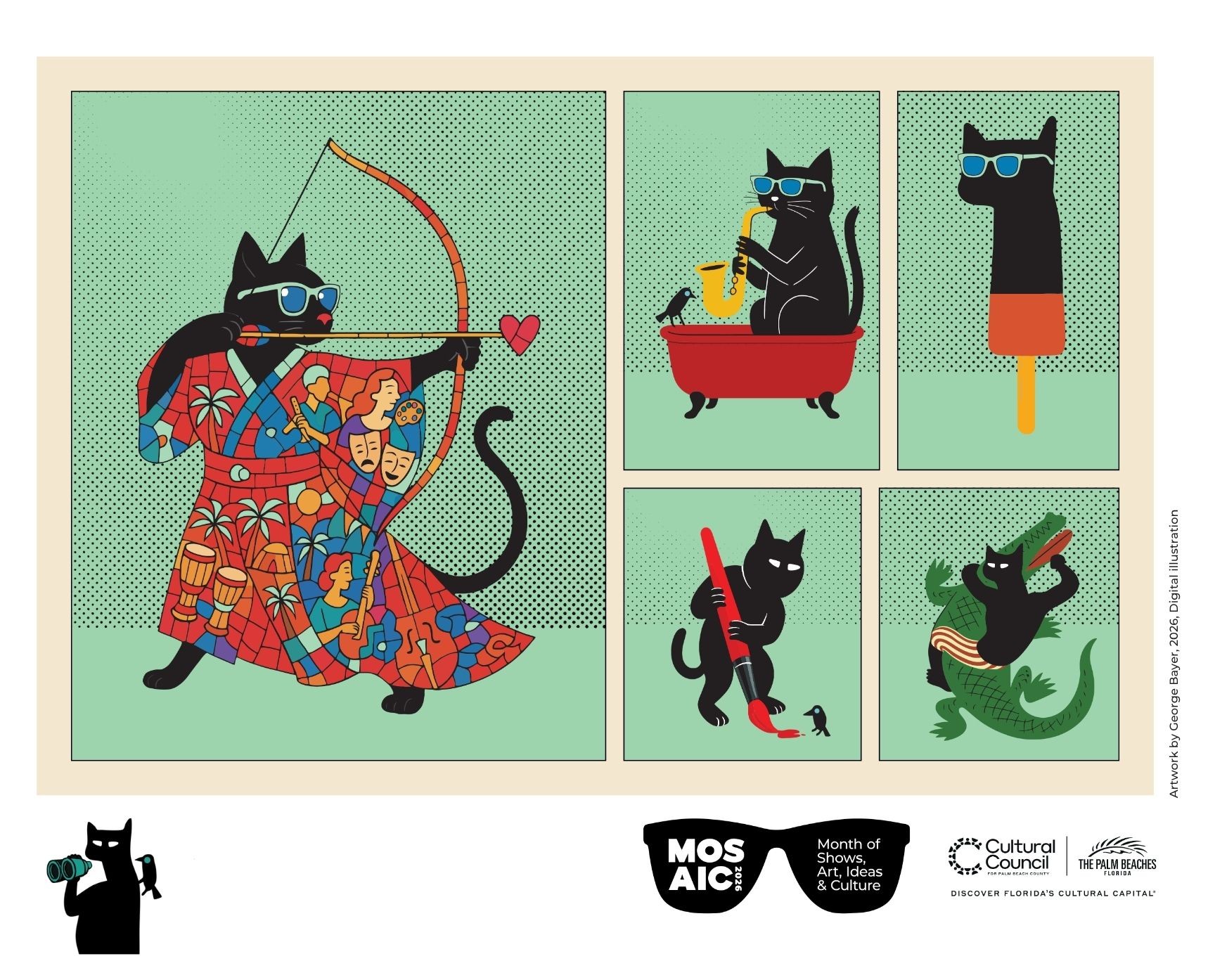 As part of its annual tradition of partnering with a Palm Beach County–based artist, the Cultural Council selected Lake Worth Beach resident and 2026 Artist Innovation Fellowship recipient George Bayer to create this year’s MOSAIC artwork. Inspired by his signature Le Chat series, MOSAIC 2026 features a cohort of “creative cats” to illustrate the many fun activities that can be found in The Palm Beaches. Four of those felines are also available as collectible and commemorative Le Chat lapel pins at select MOSAIC locations in May. Collectors can pick up a MOSAIC “Paws-port” - a paw-print-shaped passport on a MOSAIC lanyard – to show off their collection (and their travels) wherever the lapel pins are available.