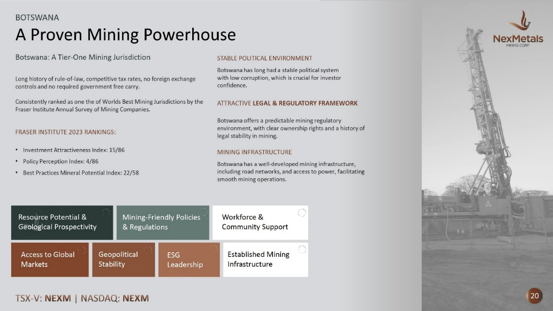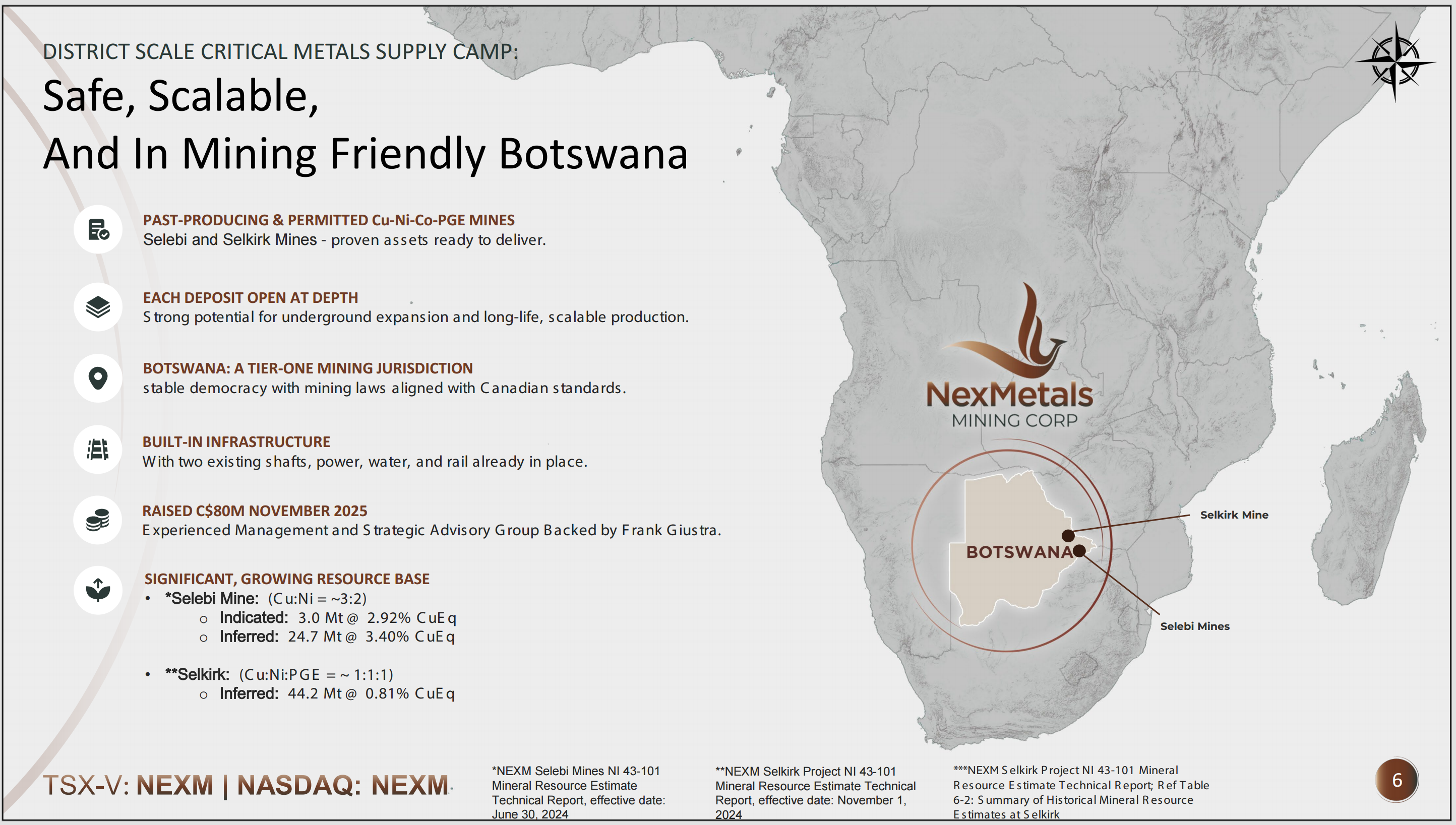 NexMetals owns two previously producing Cu-Ni-Co-PGE mines in Botswana - a safe, mineral-rich Tier 1 mining jurisdiction in Africa.