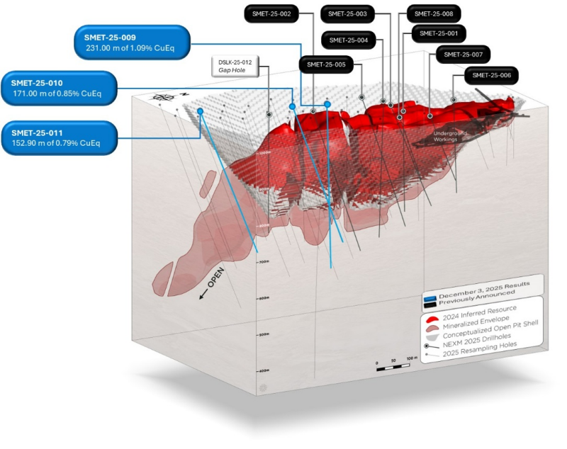 On December 3, 2025, NexMetals announced that it has drilled 231 metres of 1.09% CuEq, including 97 metres of 1.28% CuEq establishing scale, grade and expansion potential at Selkirk.