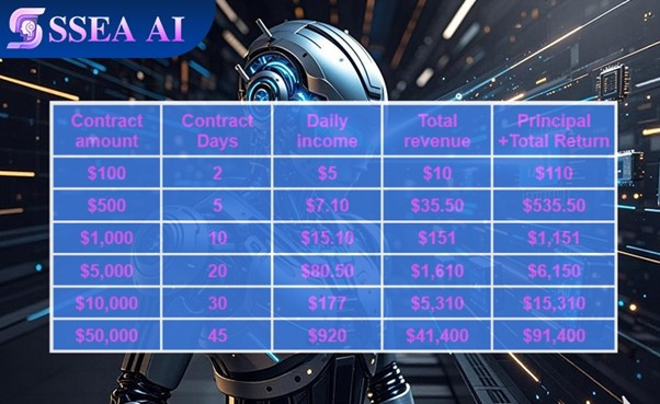 To encourage users to share digital wealth opportunities, SSEA AI is launching an affiliate program. Earn commissions by referring friends to invest. No investment is required to start earning. For example, if a friend you refer successfully purchases a $10,000 package, you'll receive a $300 commission. After inviting a certain number of active users, you'll receive a one-time fixed reward of up to $30,000. No matter how many friends you invite, your earning potential is limitless!SSEA AI offers a variety of contract options to meet the needs of users at all levels. SSEA AI specializes in cloud computing, offering contracts for mainstream cryptocurrencies such as BTC, ETH, FIL, XRP, and USDT. It provides various solutions tailored to users' risk appetite and capital size: