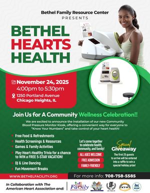 Chicago Heights, IL - Bethel Family Resource Center will host "Bethel Hearts Health," a free community wellness celebration on November 24, 2025, from 4:00 PM to 5:30 PM at 1250 Portland Avenue in Chicago Heights. The event marks the official launch of a new Community Blood Pressure Monitor Kiosk designed to provide residents with easy access to heart health monitoring.
